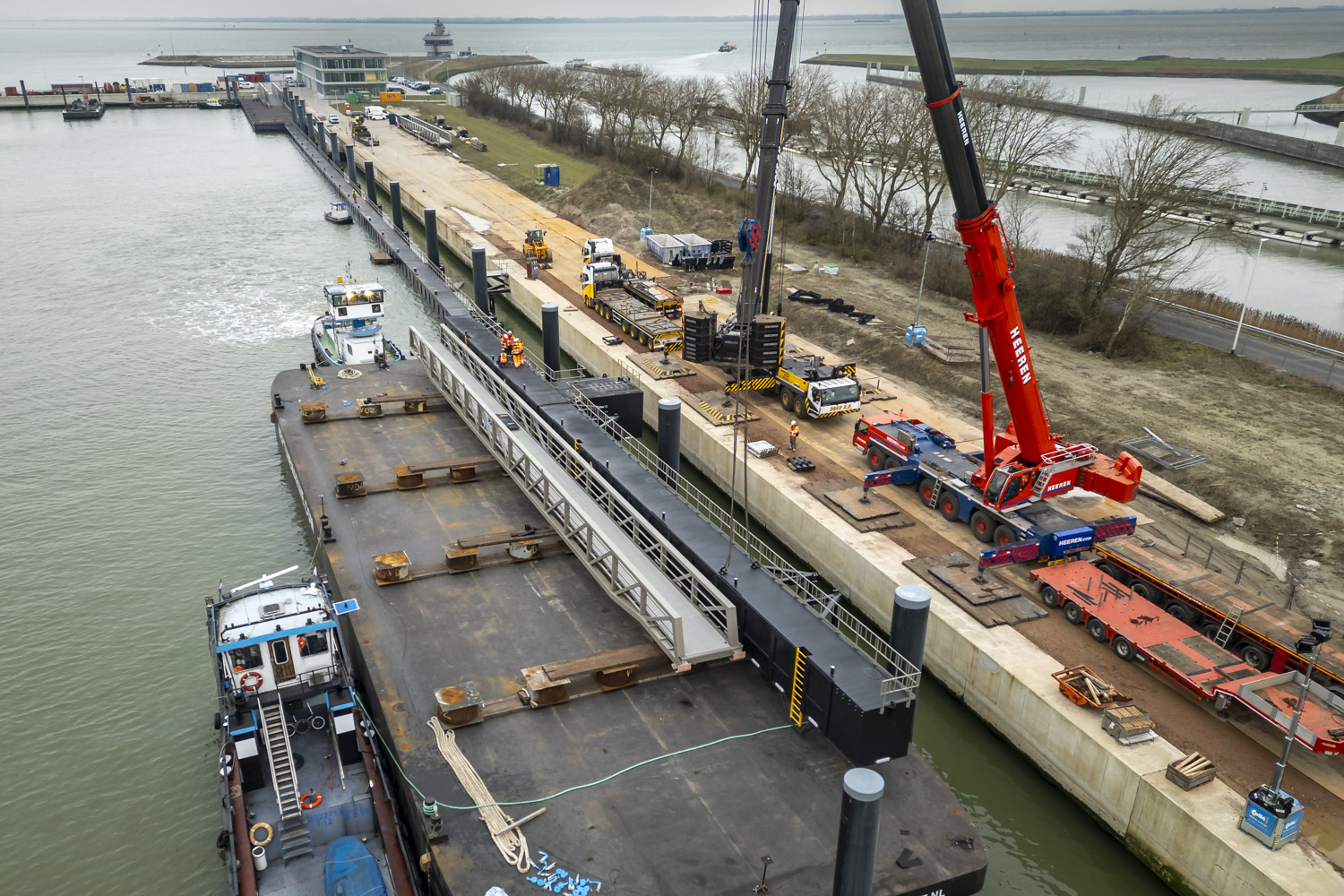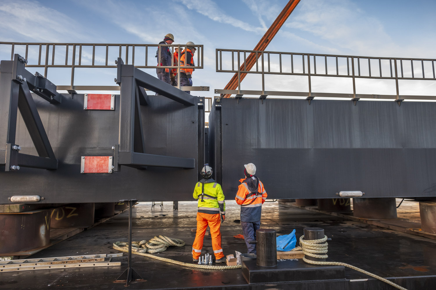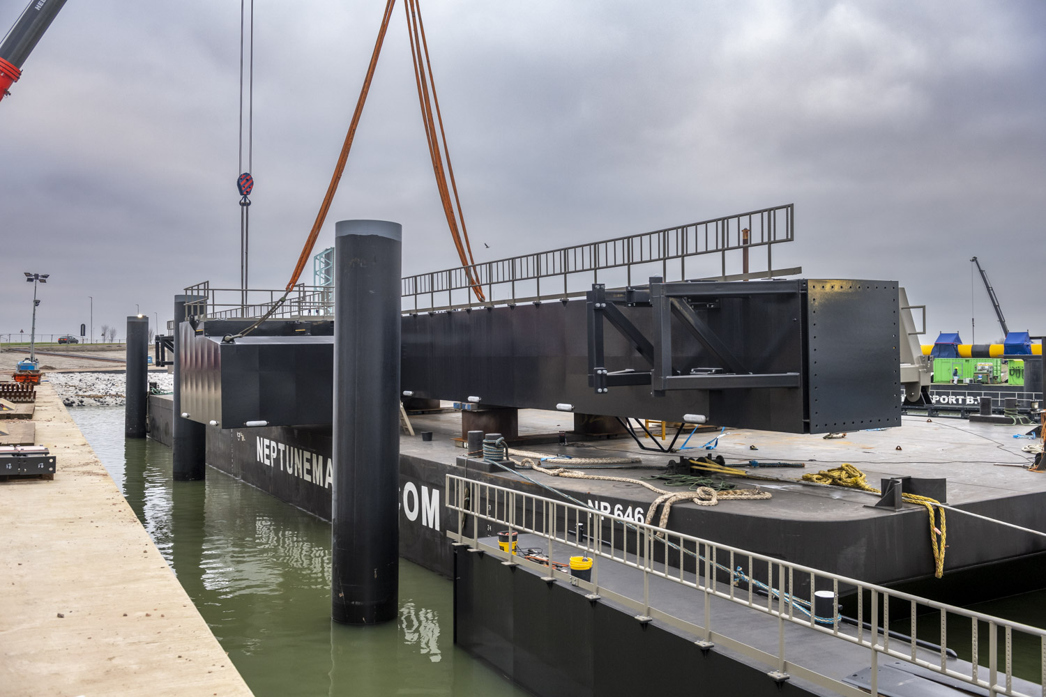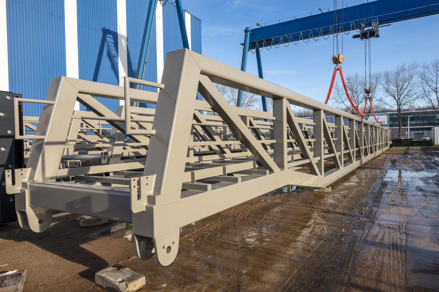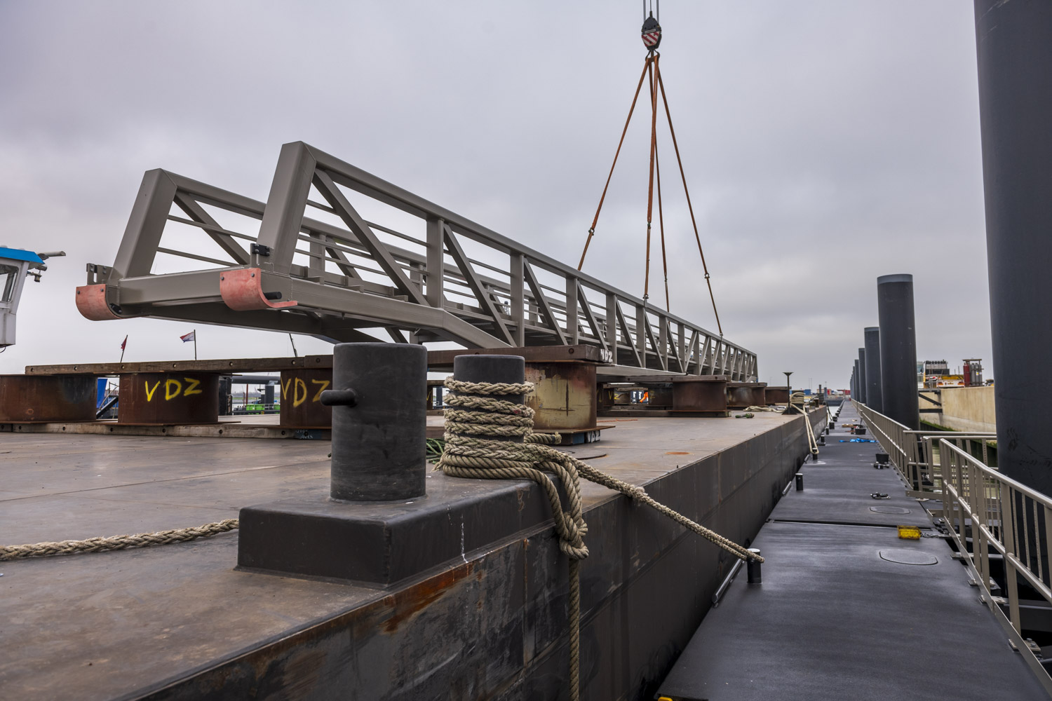 Voor de toegang tot de steigers zijn drie indrukwekkende loopbruggen van elk 46 meter lang geproduceerd – uitzonderlijk vanwege hun lengte.